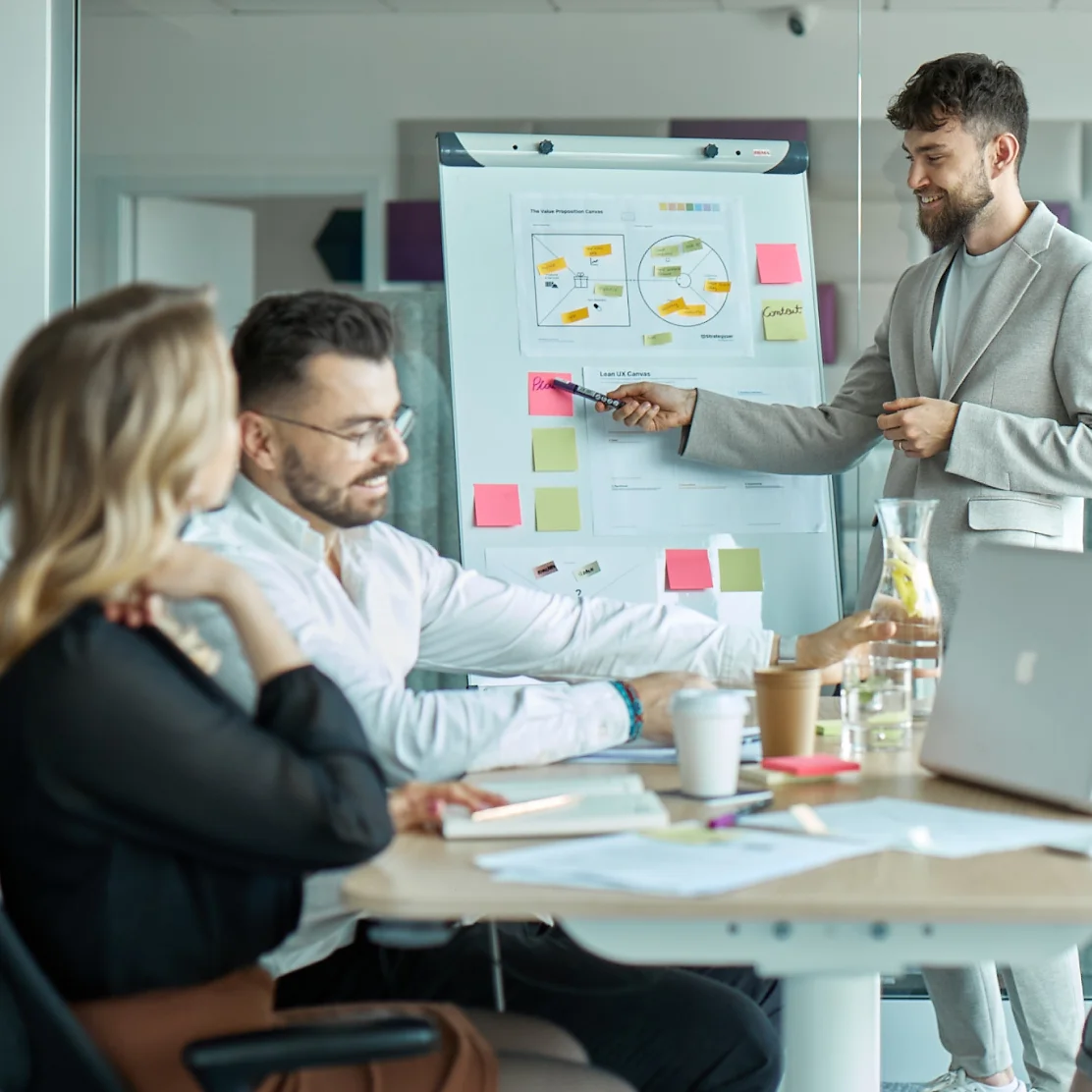 Najczęściej wybieramy formę warsztatową, która pozwala nam dogłębnie poznać klienta i zaprojektować stronę/aplikację zgodnie z potrzebami jego klientów. Warsztaty są powiązane z projektowaniem wireframe/prototypów budowanej aplikacji lub strony. Warsztaty zorganizowane są u nas w modelu Agile Scrum, sprinty najczęściej są 1 – tygodniowe. Każdy warsztat to omówienie poprzedniej paczki prac (i zdanie do weryfikacji), omówienie funkcjonalne, prezentacja pomysłów i etapu researchu, prezentacja wstępnych koncepcji i ustalenie scope na kolejny tydzień sprintu.